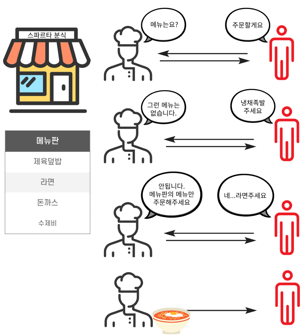 음식점에 메뉴가 제육덮밥, 라면, 돈까스, 수제비가 있다면 손님은 메뉴판에 있는 메뉴를 골라서 주문해야된다.